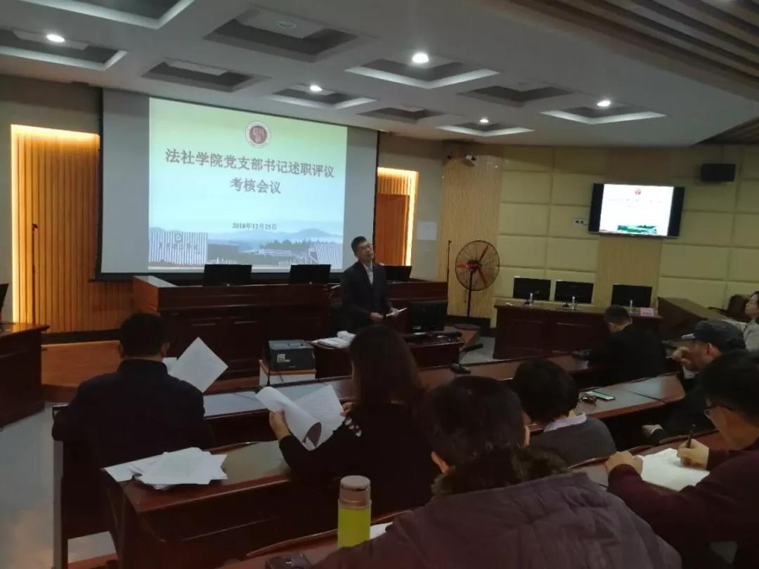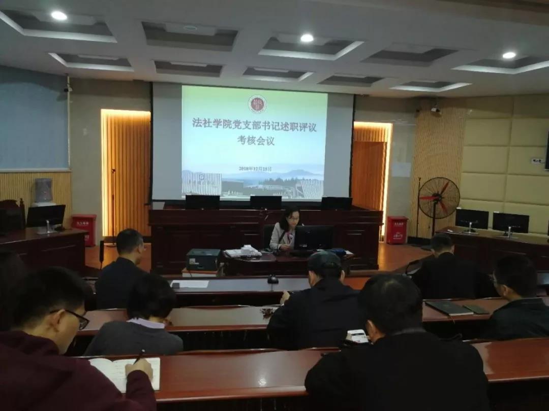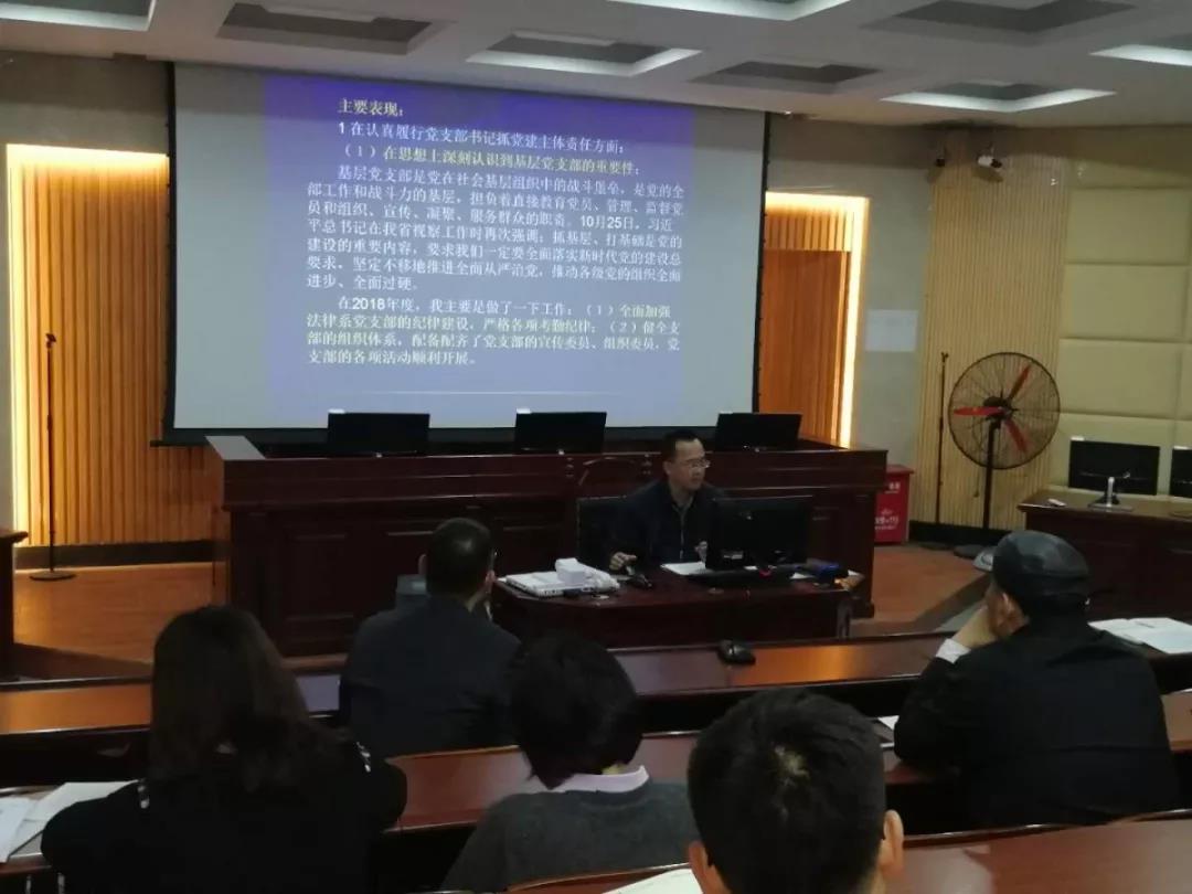 加强党的基层组织建设三年行动计划(2018-2020)》有关规定,在模拟法庭召开2018年度基层党支部述职评议考核会议。会议由党总支书记潘荣新主持,总支委员、非委员中层领导干部、专职组织员、各支部委员、师生党员代表参加会议。