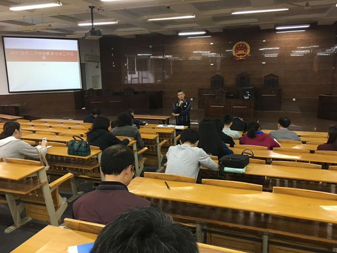 2017年4月27日,肉漫画 第二场政治理论学习会议在模拟法庭举行,全体教工参加了会议。