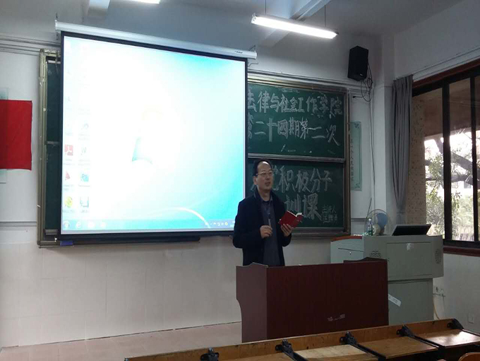 3月16日下午2:30,法律与社会工作学院第二十四期第二次入党积极分子培训课于莞城校区1301课室顺利举行。主讲人是汪辉勇老师。应到89人,实到88人。