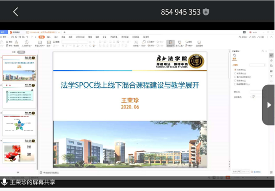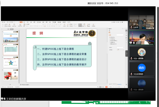 利用腾讯会议平台特邀广东外语外贸大学法学院王荣珍教授为全院师生开展了一次题为“法学SPOC线上线下混合课程建设与教学展开”的主题讲座。院长郑玉敏、副院长朱晓红、沈亚萍以及各系主任、专任教师以及部分学生代表参加了此次活动。