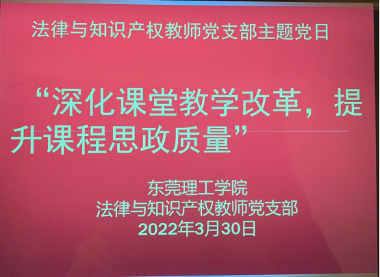 2022年“深化课堂教学改革 提升课程育人质量”教育教学大讨论的任务清单及进度安排》,法律与知识产权党支部在2022年3月30日下午以腾讯会议的形式召开了以“深化课堂教学改革,提升课程思政质量”为主题的主题党日活动。