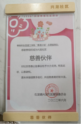 “青鸢计划”志愿服务队也很荣幸成为了兴龙社区1773慈善社区项目的慈善伙伴之一,2021级法学卓越班冯祖儿同学作为代表上台接受了感谢状,一起感受社区慈善的氛围。后续“青鸢计划”志愿服务队将持续参与到石龙的慈善活动中,为社区慈善注入青春活力。