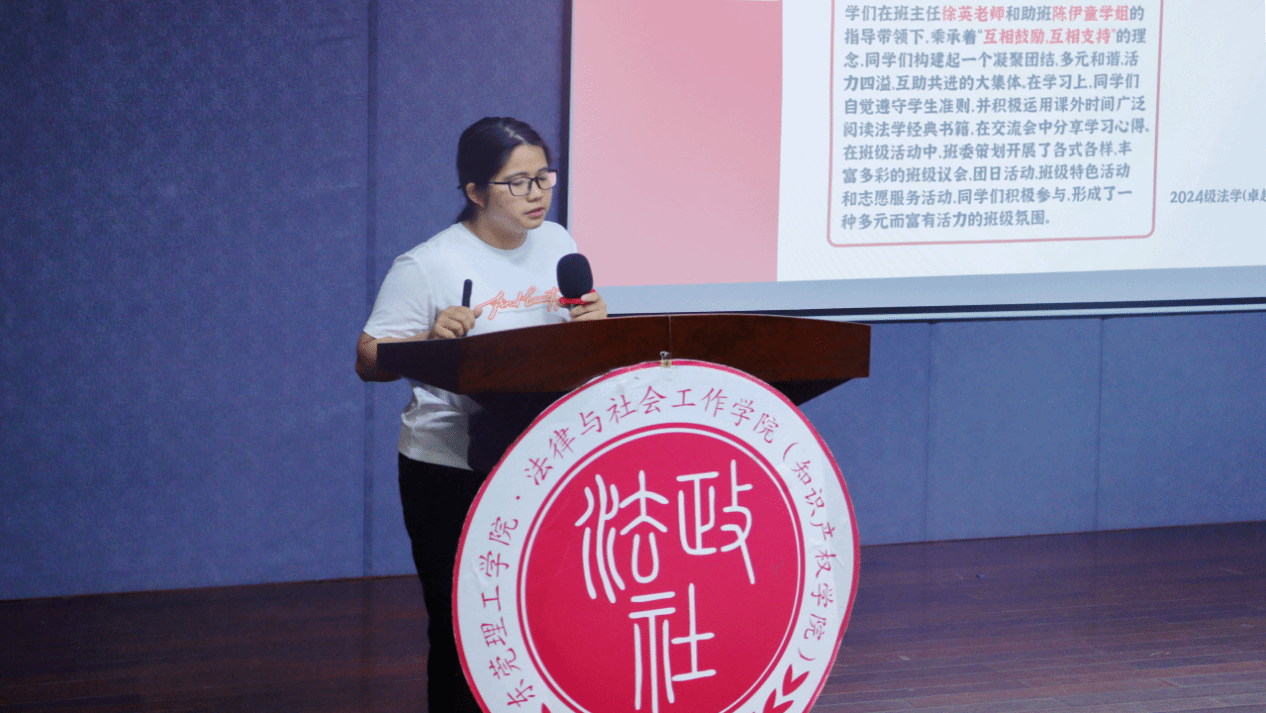 2024级法学卓越班班委郑莹莹围绕班委分工协作、学习氛围营造、班级文化建设、宿舍文明创建等方面分享了班级建设经验,为2025级新生班级建设提供了有益参考。