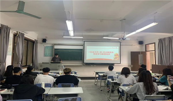 2019级社会工作1班于3月19日开展的“学党史、悟思想”主题班会中,班长林瀚向同学们讲述了习近平总书记在党史学习教育动员大会上的讲话精神,并鼓励同学们主动自觉学习党史。