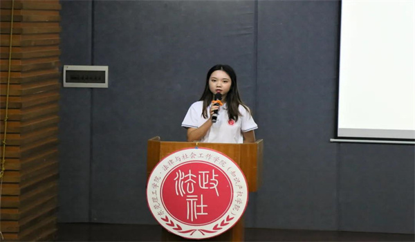 随后是团委、学生会团委常务副书记李嘉怡发言。李嘉怡师姐对团委学生会接下来的工作提出了相关规划。她表示希望打造有特色的高质量活动,加强各部门的沟通与联系,提供让团委学生会成员们施展才华的良好平台,并祝愿大家能够在团委学生会大家庭中充分锻炼和成长。