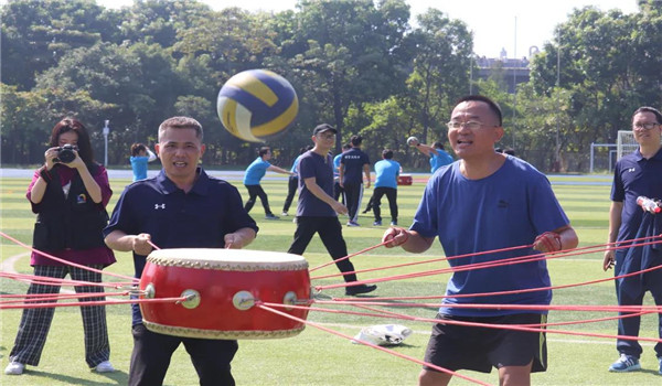 学生运动员们在运动场上奋力拼搏的同时,老师们的趣味项目比赛也热火朝天地进行着。红色的同心鼓将球高高弹起,长杆跑书写着别样的团结,老师们在比赛中的团结也给了我们别样的力量与支持。