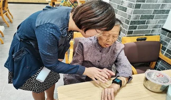 在饭堂,我们还遇到了几位佩戴了智能腕表的长者,为了更加了解长者们对智慧养老的真实感受,我们对其中一位长者进行了探访,长者还亲自为我们示范了智能腕表的使用方法。