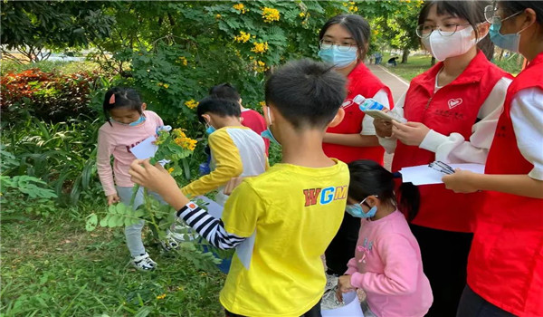 活动开始前,周屋社区社工通知社区青少年儿童提前到达现场并安排其就座。活动开始,社工给小朋友们讲解周屋社区环境情况以及环保的重要性,在初步普及相关知识后,志愿者派出两人负责随行拍照,其余八人分成四组,负责带领小朋友进行活动,小朋友都需要完成两个任务,一个是捡树叶用以后续的手工制作,另一个则是用笔纸上写出五种路上看到的自然资源。