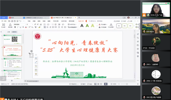 于5月25日晚7:30在腾讯会议举行“心向阳光,青春绽放”“5.25”大学生心理健康月大赛第一阶段的决赛。辅导员谢媚媚、青年教师杨瀚博和心理中心的欧阳晓莹老师担任本次比赛的评委。