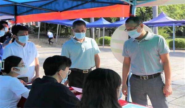 领导检查指导迎新各项工作,在迎新点充分了解新生报到情况,亲切慰问迎新点的工作人员和学生志愿者。