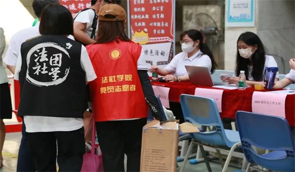 工作人员和学生志愿者早早到达各自岗位并充分做好准备工作,热情迎接每一位新生,指引新生们做好入学流程并为他们介绍校园,让学院新生充分体会到法社大家庭的温暖。