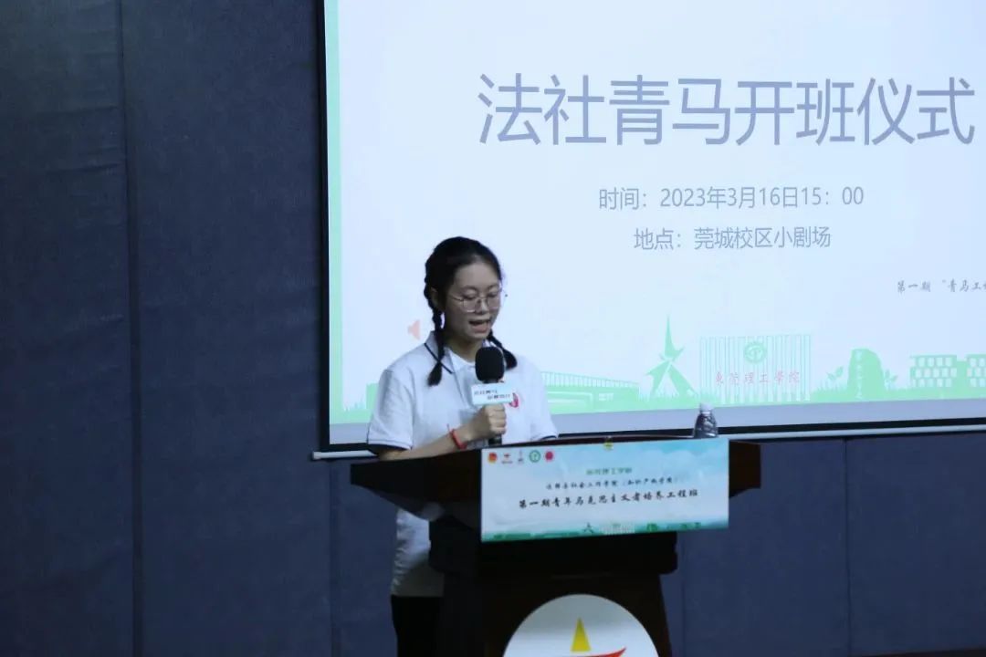 第一期“青马工程”培训班(以下简称青马班)开班仪式暨专题讲座在莞城校区小剧场准时举行。学院党委书记杜应发,党委副书记丘永辉,团委副书记邹欢,辅导员黄海娜、谢媚媚、刘海波,专职组织员黄阳辉,以及第一期青马班学员出席了开班仪式。
