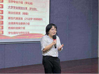 2025级法学专业新生欢迎会暨专业导引大会在小剧场举行。副院长、法律系主任罗兆婧、法律系副主任吉海荣、校友罗志凯、新生班主任杨璇、辅导员韩芷莹及法律系助理、各学生组织负责人等参加会议,与2025级全体法学新生共话专业发展,共启大学新篇。