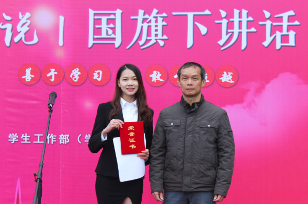 学生代表袁慧燕站上“莞工青年说”的讲台,以“我的奋斗”为主题进行国旗下讲话。她表示在踏入莞工校园的那一刻起,便定下了目标,始终秉持艰苦奋斗的理念,积极参与社会实践,挑战新的事物。她通过讲述自身进入大学以来的学习情况和工作经历,向大家叙述了她的奋斗历程以及收获。她认为在学习与工作的同时,也要学会放松自己,为同学们在忙碌的大学生活中合理安排时间提供了意见。坚持每天收获小进步,长时间积累起来便是大进步。她激励同学们坚持奋斗,励志前行。演讲结束后,中法联合学院的执行院长陈毅华为袁慧燕同学颁发了证书并合影留念。