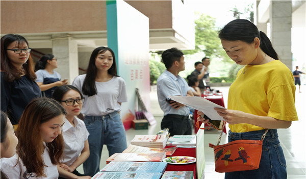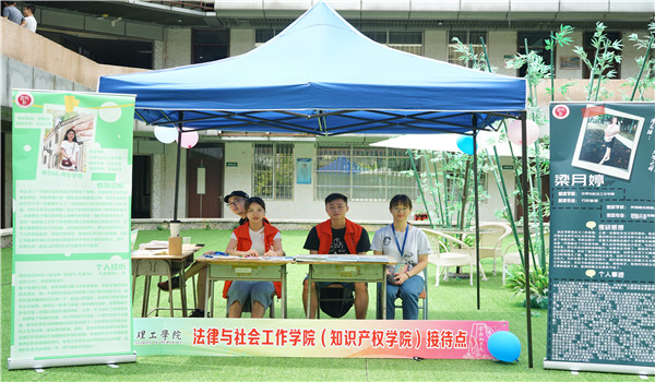 在5号楼、6号楼平台的学院接待点,工作人员向到访的考生和家长展示了学院在文化建设方面的成果,有党日活动剪辑、读书节作品集、肉漫画