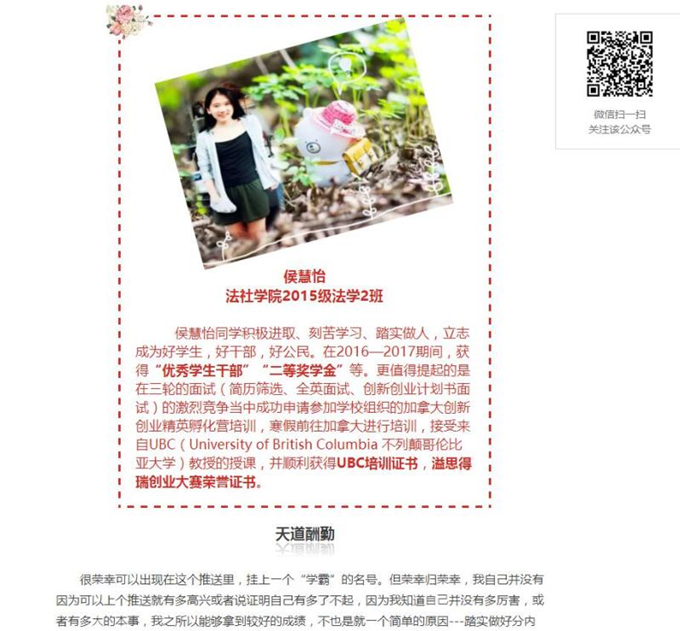 优秀学生的事迹,旨在鼓励全院学生以优秀学生为榜样,营造勤奋学习、顽强拼搏、开拓进取的良好氛围,促进学风的进一步好转,激励广大学生成长成才。