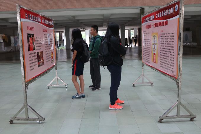下午二时,陆陆续续有学生赶往教学楼,他们步伐匆匆,经过四号楼展板区时,也不禁停下匆忙的脚步在此驻足认真阅览展板。展板内容丰富,有的同学站立在一个展板前久久不动,双眼聚精会神地望着展板,似乎研究这其中的道理。后来,到展区阅览展板的人数越来越多,展区也越来越热闹,宣传宪法的活动似乎来到高潮 ,每个人都享受参与其中,受益其中。