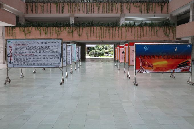 今日上午,工作人员开始布置场地,直到中午,场面就已经布置完成。展板一共两列,他们分别粘贴着宪法与平等、自由、公平以及相关法律知识。两列展板排整齐地排列在四楼大厅,严肃端庄,显示出了宪法的威严和我校对宪法日宣传的重视。