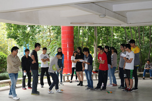 文明、和谐的社会需要相互协作,为了增进同学们之间的感情,增强班级凝聚力,同时学会相互扶持共同合作,促进班级和谐。2015年11月10日下午3点,14行政管理2团支部在2号楼一楼举行“活力在基层,成才在莞工”主题团日活动之“一路相随”团队活动。