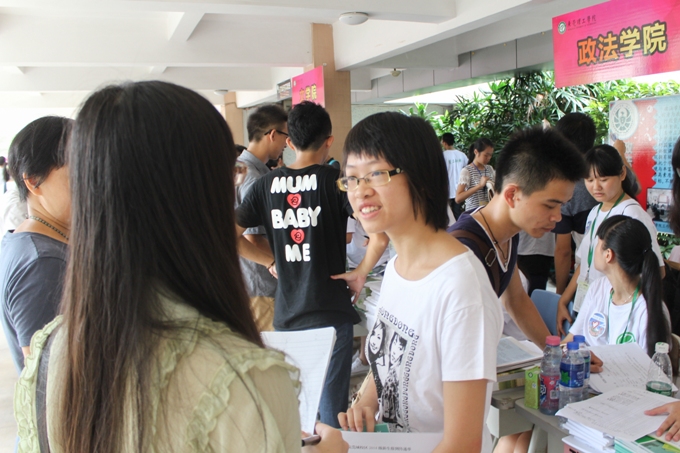 9月9日早,政法学院13级的大二志愿者们以及14级的新生骨干们很早便已等待在位于莞城校区五号楼的政法学院迎新点准备好在今天迎接新生,等待着政法学院新一拨新力量的到来。政法学院党总支书记潘荣新、辅导员邓磊老师、刘海波老师出席了政法学院的迎新活动并对迎新活动做出了指导。