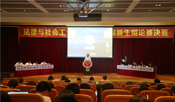 第十六届新生辩论赛决赛在莞城校区学术报告厅举行。本次辩论赛分为季军赛和冠军赛。季军赛的辩题为“社会秩序的维系主要靠道德/法律”,由2019级知识产权一班对战2019级法学二班;冠军赛的辩题为“解决霸凌更应注重从法律/教育入手”,由2019级行政管理二班对战2019级法学卓越班。出席本场比赛的嘉宾有辅导员邹欢老师,法社辩论队队长靳文怡、法社辩论队副队长曾娴榕、经管辩论队队长邓卓立、粤台辩论队队长胡晓彤作为本次比赛的评委。