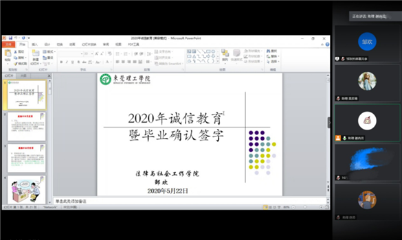 为了做好诚信教育工作,2020年5月22日晚上7点30分,法律与社会工作学院召开2016级贷款毕业生诚信教育会议,辅导员邹欢老师出席并主持会议。
