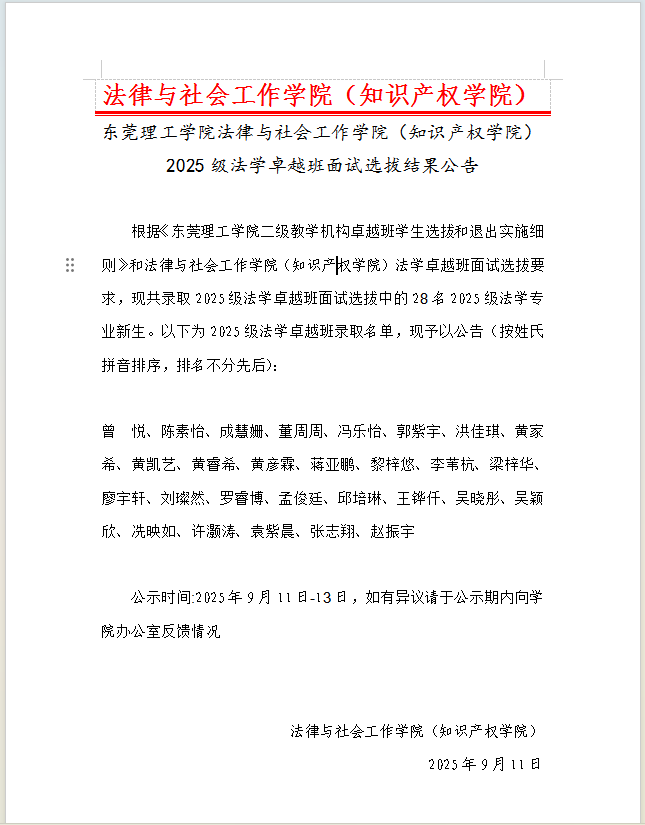 肉漫画 2025 级法学卓越班面试选拔结果公示