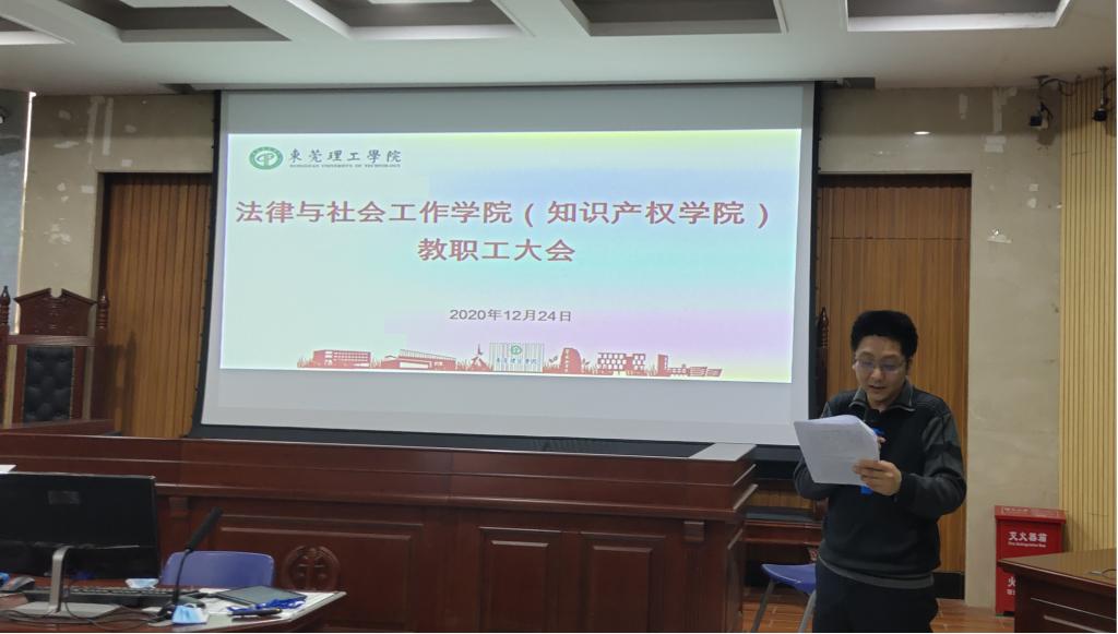 在莞城校区模拟法庭召开全院教职工大会,会议对2020年学院工作和分工会工作进行总结,学院全体老师参加会议。