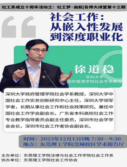 2023年12月13日晚19:30,社会工作系专业品牌活动:社工梦启航|名师大讲堂第十三期深圳大学徐道稳教授讲座在莞城校区学术报告厅顺利开展。此次,社会工作系邀请深圳大学政府管理学院社会学系徐道稳教授为我校师生与东莞一线社工做《社会工作:从嵌入性发展到深度职业化》的报告。肉漫画