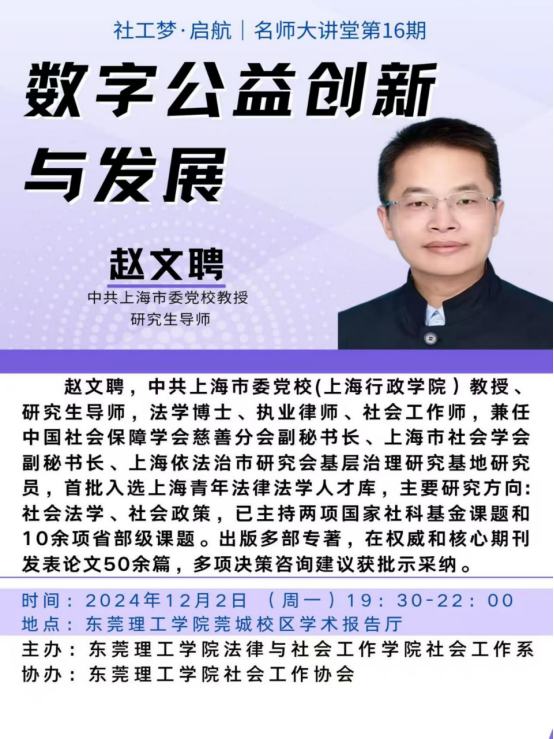 为更好地学习贯彻习近平总书记关于公益慈善发展的重要精神,2024年12月2日晚,社会工作品牌活动社工梦·启航名师大讲堂第16期在莞城校区小剧场举办。本次名师大讲堂活动邀请了中共上海市党校赵文聘教授为肉漫画
