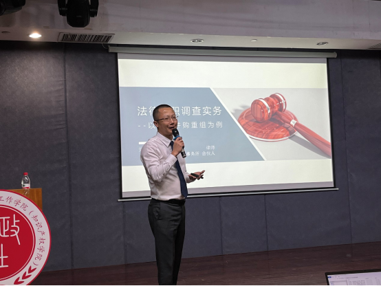 陈晓彬律师从尽调的意义、尽调操作清单、办案经验总结、尽调注意问题四个部分,详略得当地进行法律尽职调查实务经验分享。在第二部分核心内容中,以企业并购重组为例,从如何设计尽调清单开始,如何实施查验结束,着重为同学们介绍了法律尽调的10条检查项与11项实施流程,坚守五项基本原则,拒绝我认为与想象,调查对象存在哪些问题,有哪些存在的法律风险和后果,有何补救方案、法律措施可以给到顾客,即发现、分析、解决问题的过程。并为同学们特别提示如何撰写法律尽调报告“但书”部分,即在提示法律风险的同时,应尽量结合调查的目的就法律风险的规避提出合理建议,承办律师需要特别说明风险以及此等风险的防范处理。大家都专心致志地聆听并思考陈律师讲述的内容。
