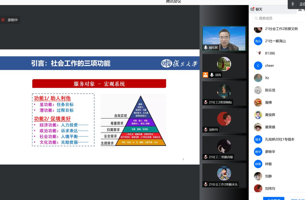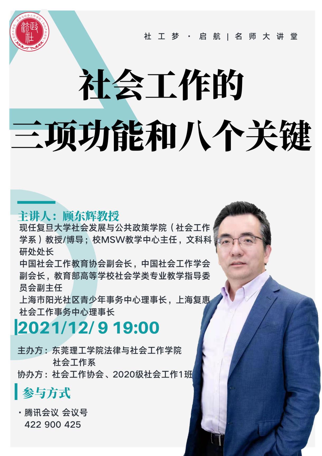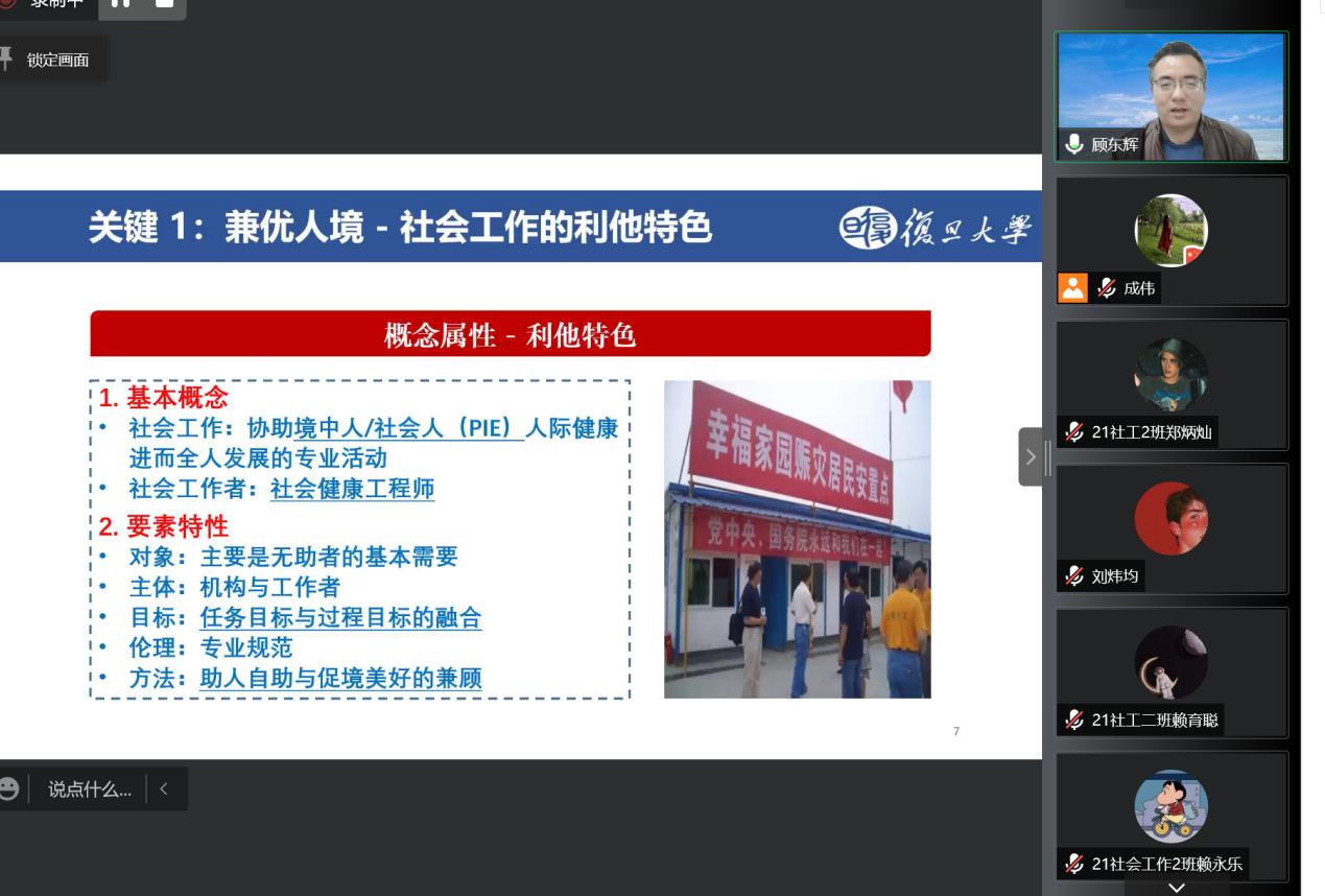 2021年12月9日19:00开始,法律与社会工作学院(知识产权学院)社会工作系在线上举办了社工梦·启航|名师大讲堂线座。本次讲座特邀中国社会工作教育协会副会长、教育部高等学校社会学类专业教学指导委员会副主任委员、复旦大学社会发展与公共政策学院(社会工作系)教授、博导顾东辉做“社会工作的三项功能和八个关键”的主题报告。社会工作系系主任成伟教授主持本次讲座,社会工作系全体教师及学生参加了本次讲座,同时还有来自全国其他高校的师生、一线社会工作者共计近400人参与了本次线上活动。