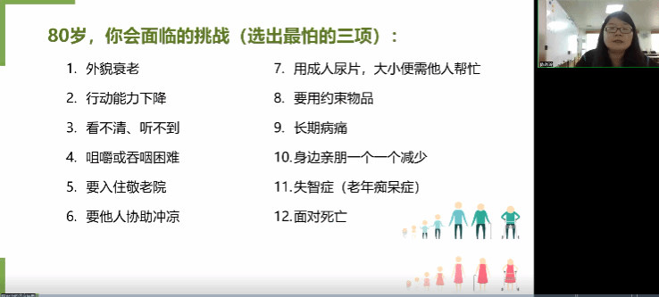 紧接着,陈社工就“为什么要开展老年社会工作服务”这一主题进行了分享。陈社工与同学们进行了互动,同学们纷纷思考,是完成合同指标更重要,还是回应服务对象需求更为重要。陈社工让同学们选出80岁最害怕面临的挑战,在提前设想将来的老年生活将面临的困境的过程中,同学们拉近了自己与老年人的距离,更加深入地了解到了老年人的种种困境,也更能真切地感受其心理,了解其需求。