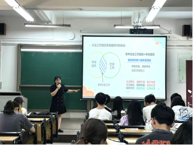 为了让同学们更加了解老年社会工作实务,了解老年社会工作的发展,老年社会工作课程老师林寒特别邀请了东莞市鹏星机构社工徐梦茵于2023年5月29日上午为2021级社会工作的学生分享其自身的机构经历和一些真实案例。