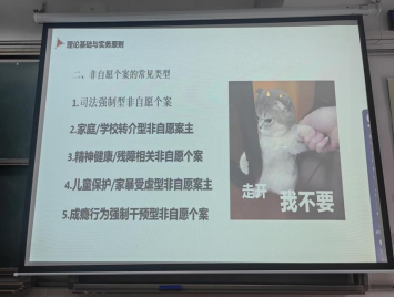 特邀东莞市社会工作协会中级督导、国家三级心理咨询师何柳莹老师在6301教室为2023级社会工作专业的学生带来了一场主题为《非自愿个案有效会谈及介入策略》的课程分享。此次活动旨在通过实务专家的分享,帮助学生们更好地理解非自愿个案的实际操作流程和策略,促进理论知识与实践应用的有效结合。