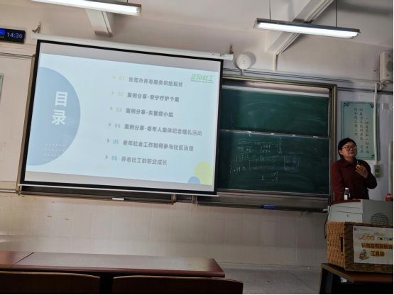 24级社会工作专升本班开展老年服务领域实践专题分享会。经林寒老师邀约,东莞市正阳社会工作服务中心长者领域社工主任、塘厦镇综合养老服务中心主管陈彩玲,围绕老年社会工作核心场景,分享深耕多年的专业经验与服务策略,为学子注入实践动能。