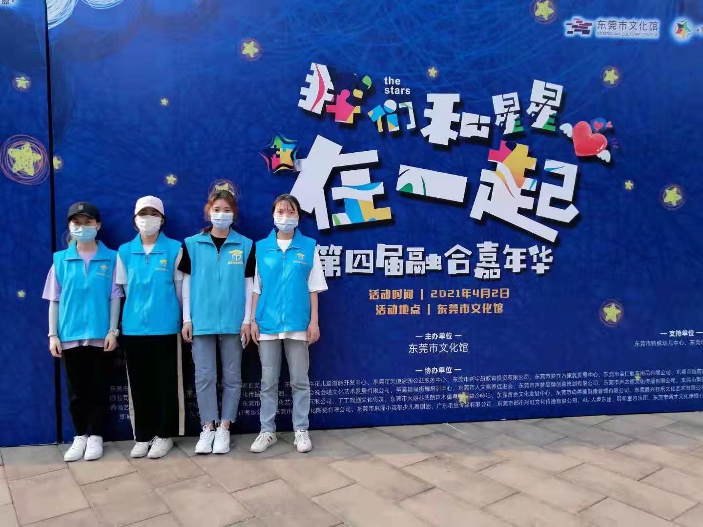 的“筑爱星家”志愿服务队在2017社会工作专业蔡贝仪同学的带领下跟随东莞市彩虹伞特殊孩子家庭支援中心参加了由东莞市文化馆联合东莞星星联盟、东莞市公共文化服务社会组织孵化中心开展的“‘我们和星星在一起’第四届融合嘉年华”系列活动。通过协助现场活动展示、设计活动等环节引发社会各界对孤独症儿童的积极关注和大力支持。
