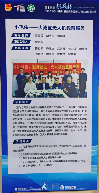 龚红兵、胡庆乐、刘海波老师指导的项目“小飞侠——大湾区无人机教育服务”成功入围了本次决赛,并以校排名第五的佳绩成功入围“挑战杯”省赛。