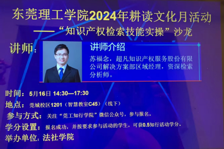 产业导师、北京市京大律师事务所(深圳)的苏福念老师,为我们带来了一场主题为“知识产权(专利)检索技巧”的知识产权实训课堂讲座。此次讲座旨在提升我校师生以及社会各界对专利检索的认识与操作能力,进而推动科技创新与知识产权保护的深度融合。