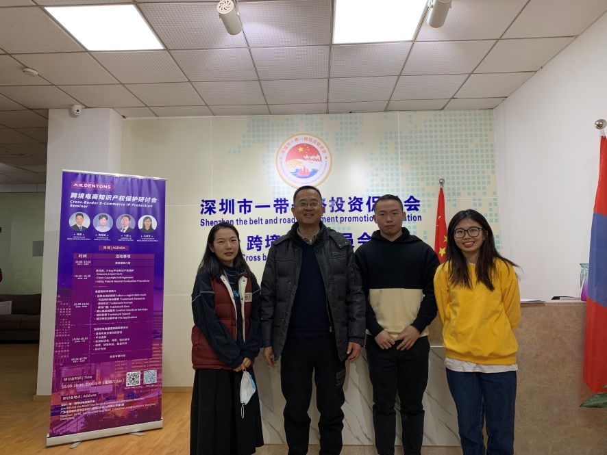 知识产权学院龚红兵主任带领学生林学海、王微微、杜翔燕、黎思思、杨靖雯参加由大成律师事务所深圳办公室以及联合深圳一带一路跨境电商委员会举办的“跨境电商知识产权保护研讨会”主题活动。出席此次会议主讲嘉宾有美国芝加哥肯特法学院法学硕士张勇、英国杜伦大学法学硕士陈裕敏、美国代顿大学法学博士卜韬以及广东商达律师事务所资深律师马淑芳代为主持人。