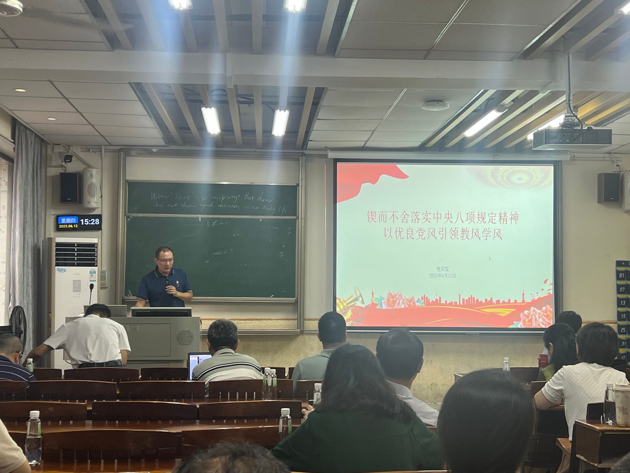 党委书记杜应发以“锲而不舍落实中央八项规定精神,以优良党风引领教风学风”为题,给教师党支部全体党员讲专题党课。