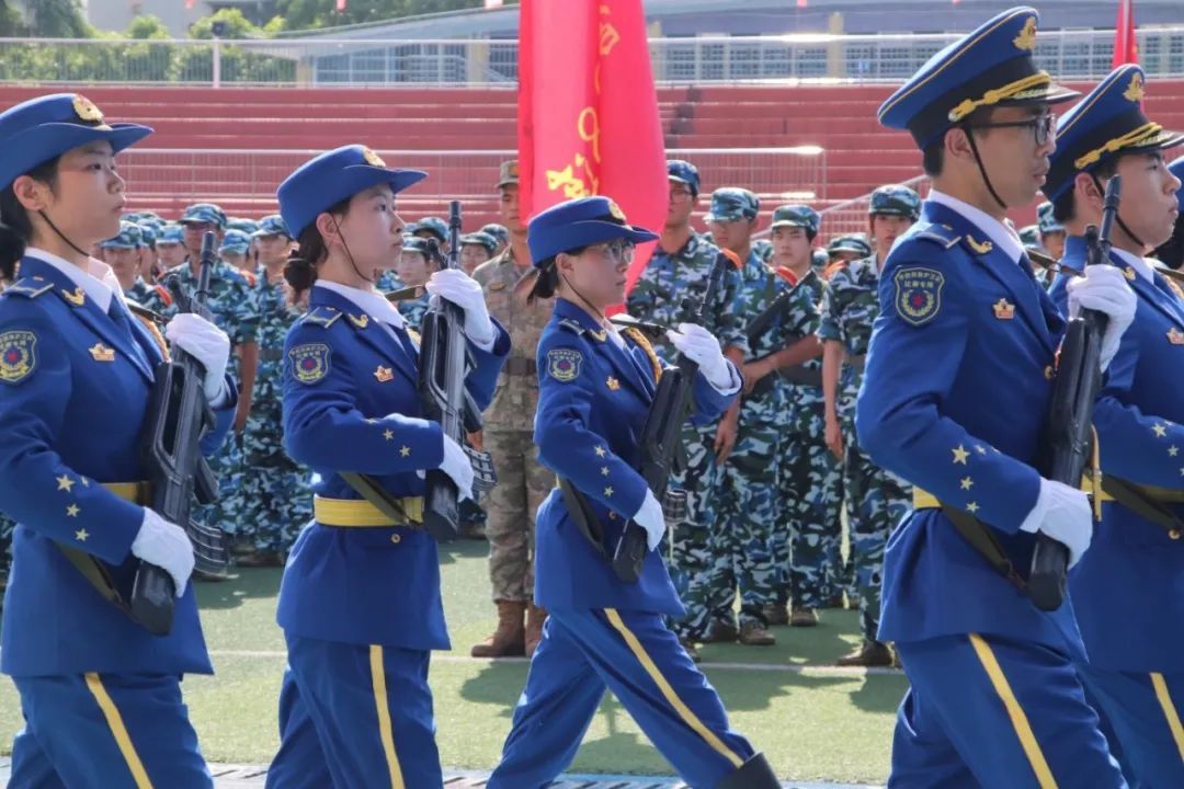 在教官的号令下,各方队整齐列阵,如潮水般依次进入场地。旗手高举队旗,方阵在旗帜的引领下威武前行。整齐的步伐声如雷贯耳,在大地上回荡。同学们精神抖擞,动作标准而利落。